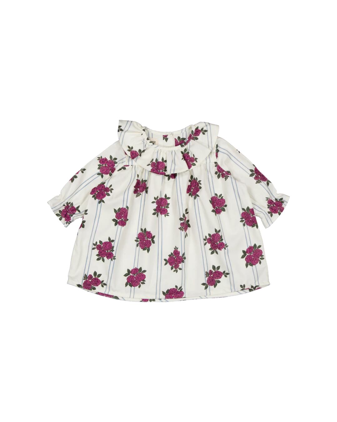 大きなフリル付きカラーと、印象派をテーマにした花柄プリントが、FW25コレクションの中心となる、ユニークで詩的な一品を生み出しています