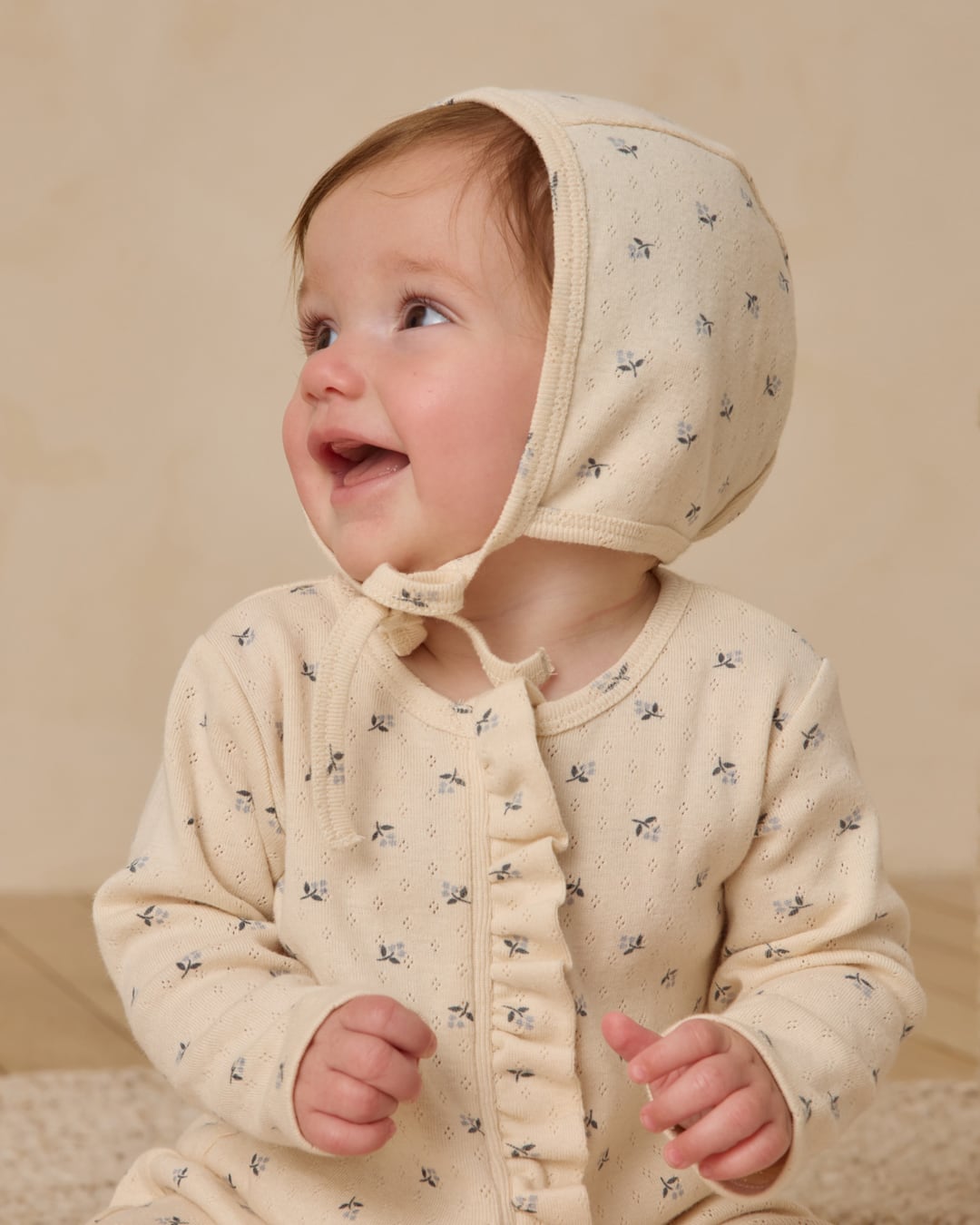 柔らかなオーガニックポインテールを使用した、この愛らしいベビーボンネットは、あご部分に繊細な紐が付いているので、しっかりと快適にフィットします