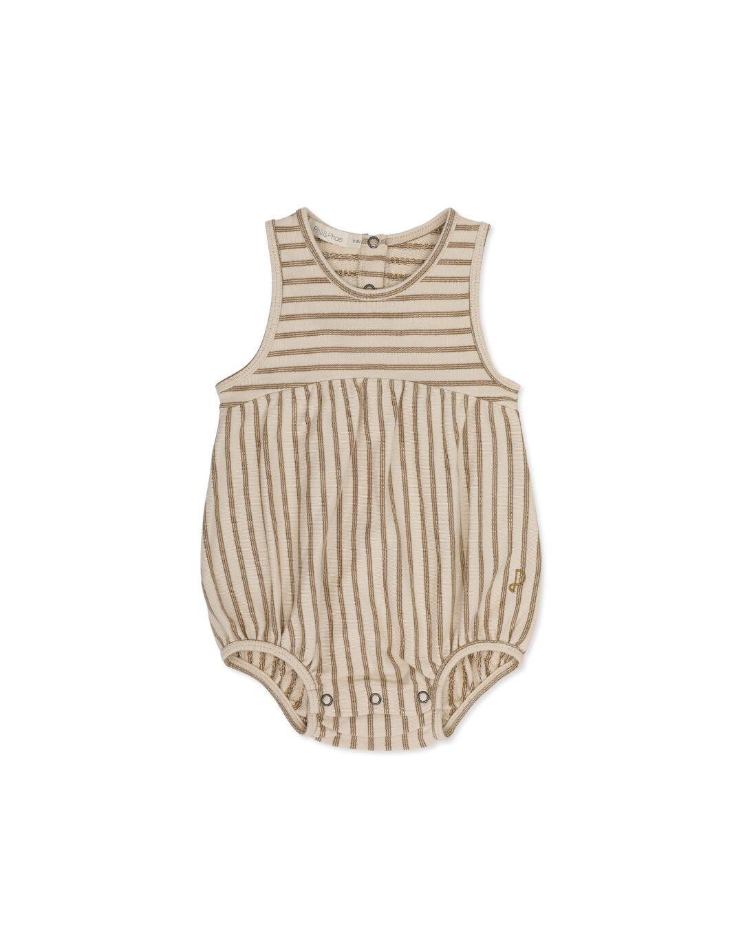 ストライプの方向が対照的で遊び心あふれる、愛らしいロンパース